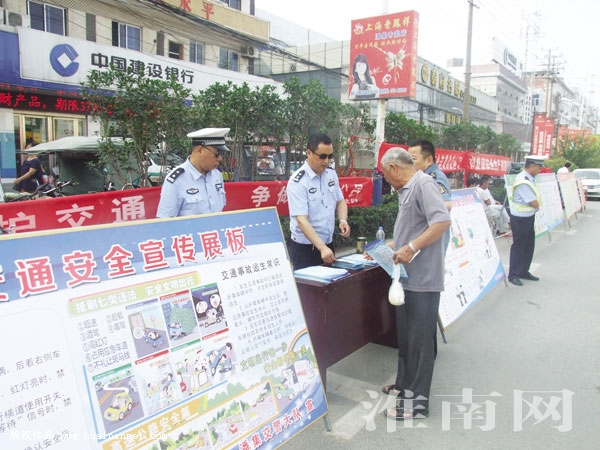 据了解,此次活动共展出交通安全宣传展板4块,悬挂宣传条幅2条,发放各类宣传资料2000余份,接待市民法律咨询60余人次。图为潘集交警大队交警走上街头进行宣传。