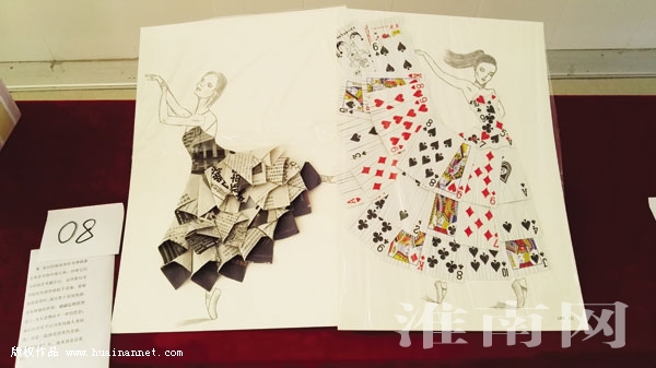 6月20日,淮河早报、淮南网记者在该学院看到,长长的展台上放置了近百种各式各样的艺术品,有“海底世界”、动物收纳盒、风铃、花房……五颜六色看得人眼花缭乱。然而,让人没想到的是,这些艺术品全部都是用废弃的材料做成的,轻盈飘逸的风铃其实是用吃完的果冻盒子配上小饰品串接而成,花房则是用一根根废旧的一次性筷子拼粘而成……最使人眼前一亮的是两幅美女翩翩起舞的画作,用扑克牌和报纸巧妙叠加粘贴制作而成,不得不感慨学生们创意无限(如图)。