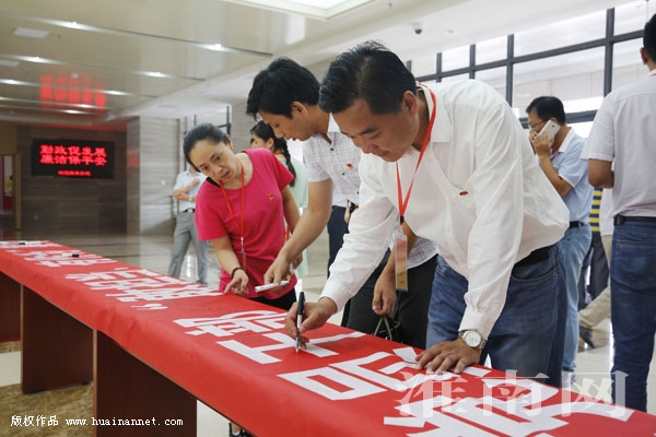 6月22日,大通区党性教育“红色专线”正式启动。大通区委结合“敢担当、有作为”集中教育,整合大通万人坑教育馆、上窑新四军纪念林、淮南市国防教育基地、淮南市廉政教育基地等境内红色教育资源,以“立足本区、面向全市”的工作理念,推出“一馆一林两基地”现场导学模式,充分发挥红色资源优势,增强党员党性意识,进一步激发党员立足岗位做奉献、服务发展当先锋的工作热情。图为举行党员干部“敢担当、有作为”集中签名活动。