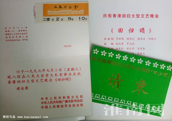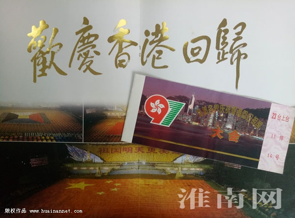 今年7月1日,是香港回归祖国母亲怀抱20周年。在这举国欢庆的喜悦日子里,6月29日,淮河早报编委、时事文体部主任张越把珍藏的20年前参加首都北京庆祝香港回归高规格的纪念大会和文艺演出请柬和相关资料,带到办公室展示,让同事们分享当时的幸福时刻。