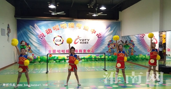 7月9日,安徽省首次拉拉操七彩星级运动员认证工作在淮南市悦动体育艺术教育举行。来自淮师附小、市直机关幼儿园、田家庵区第八幼儿园、洞山中学、大通港琛童心幼儿园的45名队员参加了80个场次的考级评定,分别获得22个红星级、11个橙星级和12个黄星级的徽章。