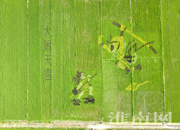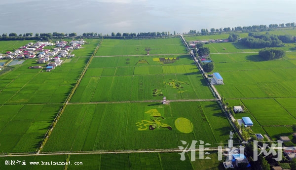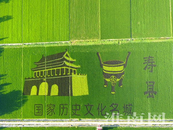 寿县安丰塘(古名“芍陂”),号称“天下第一塘”,是全国重点文物保护单位。大塘周边,阡陌纵横、良田万顷。近年来,安丰塘镇党委、政府依托难得的旅游资源,大力发展观光农业,在塘北头的稻田里种植不同品种有着不同颜色叶子的水稻,绘制颇具地方特色和风格的“稻田画”。一幅幅色彩艳丽、美轮美奂的稻田画,为周边城市游客休闲观光提供了好去处。