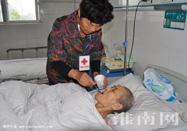 2013年国庆街道有位孤寡老人摔伤住院,看护成了大问题,社区向市红十字会求助帮忙。市红十字会安排志愿者24小时轮流看护,张大妈又报了名。当时她老伴也因大腿骨折不能动,她自己也锁骨骨折还在恢复中,她却每天一早把烧好的饭菜放进电饭锅炉里,把锅放到老伴床边,又风尘仆仆地直奔市区的医院。在医院她像对待自己的亲人一样细心地照顾着那位孤寡老人,给老人喂药喂饭,擦洗身体、端屎端尿,一个小时给老人翻下身,每次翻身,她因锁骨受伤使不上劲,都会累得筋疲力尽,就这样她一看就是一天一夜。市红十字会工作人员劝她回去休息,她不肯,要给她搭一个年轻的志愿者她也不同意:“你们都要上班,下班再来看护,太辛苦。我不上班,熬夜累点没事。我比你们年轻人更会照顾老人。”