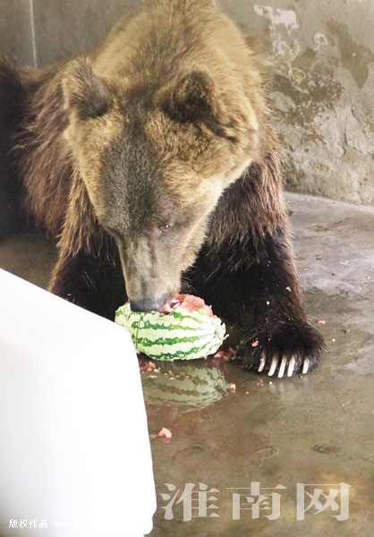 图二:棕熊在冰块前津津有味地吃着西瓜。