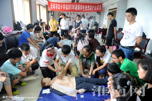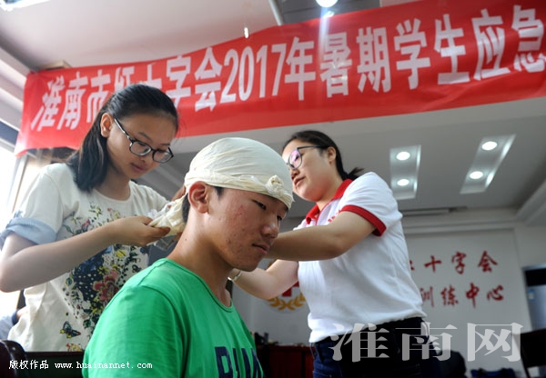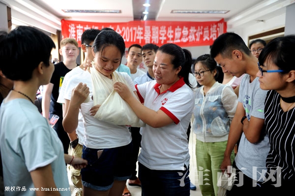 日前,市红十字会对青年学生志愿者进行骨折包扎应急救护技能培训。暑假期间,市红十字会针对生活中可能遇到的骨折、摔伤、溺水等各类突发意外伤害事件发生,对青年学生志愿者进行急救技能科学培训,提高青年志愿者应对突发意外伤害急救处置能力。图为市红十字会对青年学生志愿者进行急救训练。