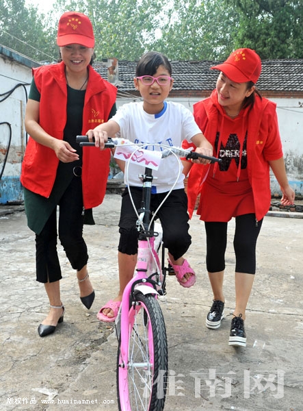 图二:凤台县刘集镇粮站留守儿童赵鑫开心试骑爱心志愿者捐赠的自行车。