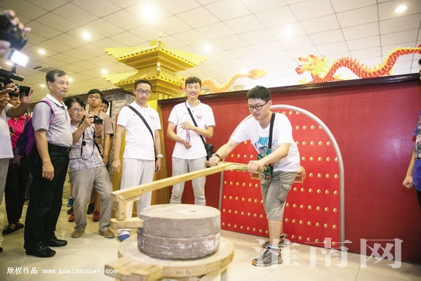 8月23日至26日,台湾嘉义高中25名师生来淮开展访学活动。期间,他们与淮南二中学生一起上交流课,共同登台演绎;分别入住22户淮南家庭,体验“新同学”的家庭生活;参观寿县博物馆、古城墙、宾阳楼和“天下第一塘”安丰塘,走进安徽八公山豆制品有限公司,感知淮南悠久厚重的历史文化,共话两岸一家亲。图一、共话两岸情交流晚会。图二、共同体验豆腐制作。