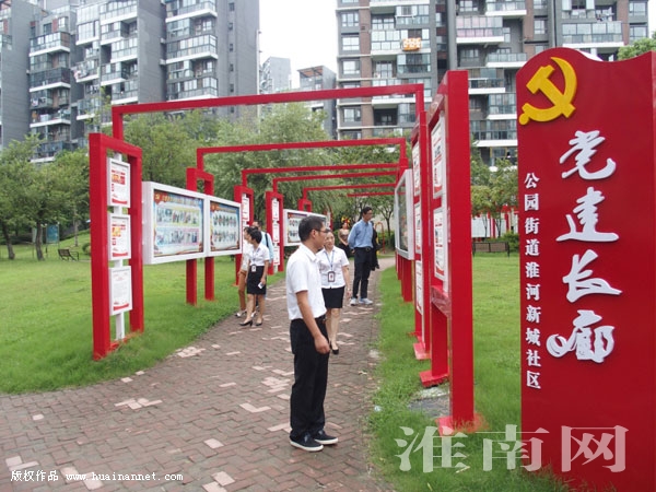 党建长廊长60米,高3米,其中,大型展板40块,小型展板48块,共计88块。整个长廊以党建文化为引领,似一条鲜艳夺目的红色绸带点缀着绿色如茵的淮河新城社区,亦如一座红色桥梁连接着社区党群服务中心和群众文化活动中心,在党群干群之间架起了一座连心桥。