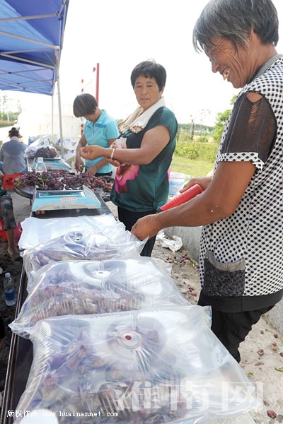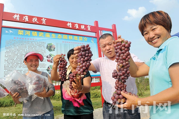 潘集区架河镇武庙生态园精准扶贫产业项目种植的葡萄通过电商进行线上销售,增加贫困户收入。武庙生态园原是一片淮河支流低洼地,村里党员种植大户通过土地流转,按照“新型经营主体+贫困户+园区引领”经营模式,通过产业精准扶贫,带动75户贫困户走上脱贫致富路。