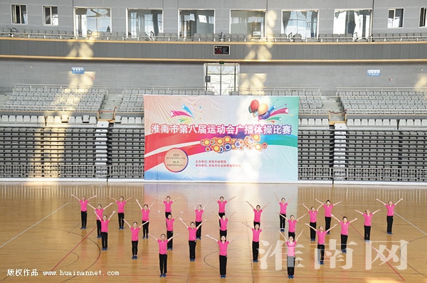 9月16日至17日,市八运会广播体操比赛在市体育文化中心举行。来自各县区、各系统和学校的16支代表队400余人参加了中、小学部和社会部的比赛。图为比赛现场。
