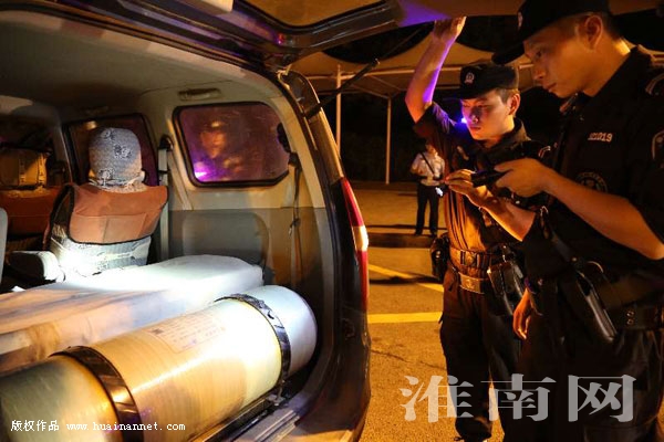 近日晚,为净化社会治安环境,确保治安形势稳定,淮南市公安局山南新区公安分局抽调巡防大队、刑警大队、派出所等业务部门精干警力与交警、武警成立了联合设卡盘查小组,在山南高速出口开展武装设卡盘查集中统一行动。对进入淮南市的机动车辆依法进行盘查,重点盘查、查缉车内可疑人员和物品;截查无牌无证、假牌假证、酒驾毒驾、涉嫌盗抢机动车辆以及枪支、管制刀具等违禁物品;控制人赃外流,震慑和打击涉恐、涉枪、涉爆、涉黑、涉毒以及“两抢一盗”等违法犯罪活动。