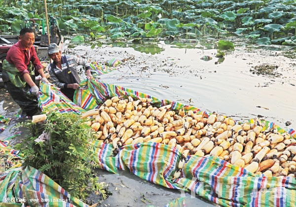 9月23日,大通区孔店乡村民在蔡城塘采挖、清理莲藕准备上市销售。国庆、中秋前夕,孔店乡6千余亩莲藕喜获丰收,村民们加紧起藕上市,抢占市场。近年来,大通区鼓励和扶持了一批集莲藕生产、生态修复、观光旅游为一体的莲藕生产示范基地,为农业综合开发、农民脱贫致富打下了坚实基础。