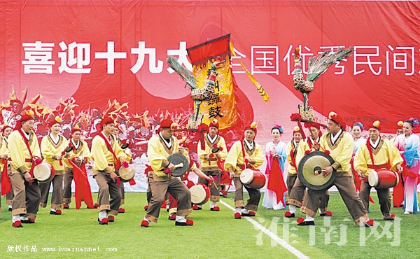 盛世欢歌,鼓声铿锵。10月9日至11日,“我们的节日·喜迎十九大·全国优秀民间欢庆锣鼓展演”在陕西省洛川县举行,我市寿县寿州锣鼓队做为安徽省唯一代表参加展演。队员们的精湛表演,充分展现国家历史文化名城寿县古城百姓喜迎党的十九大的热烈情怀,赢得了现场观众以及其他参演锣鼓队的一致好评。
