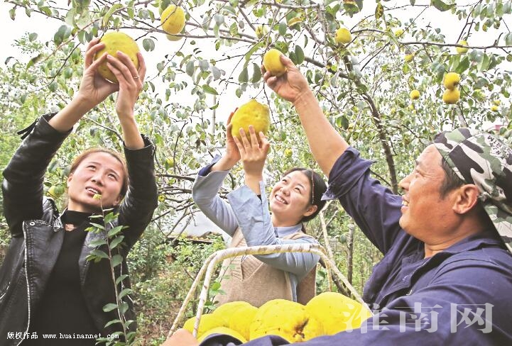 10月16日,八公山区山王镇林场村果农正在采摘新鲜木瓜。今年,林场村种植木瓜1000多亩,预计产量300多吨,产值在130万元以上,是名副其实的“木瓜之村”。近年来,该村依托丰富的林木、果蔬资源积极发展生态旅游,吸引各地游客前来踏青赏花、采摘观光,拓宽当地果农致富之路。