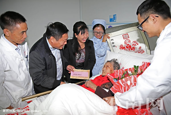 10月26日,重阳节前夕,田家庵区曹庵镇的工作人员来到淮南东方医院集团肿瘤医院,看望108岁的长寿老人杨春香,并送去了慰问品和衷心祝福。