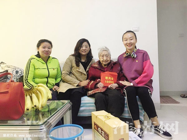 日前,田家庵区老龄委、新淮街道民政办和文化社区工作人员邀请市第一人民医院医生、护士,来到百岁老人胡长青家中进行走访、慰问,了解老人的身体及生活状况,送上节日的祝福,祝她生活幸福安康。