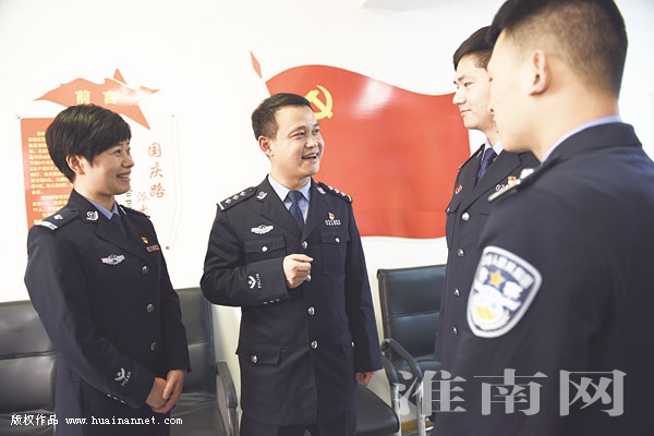 近日,十九大代表、田家庵公安分局刑警大队副大队长张万党(左二)走进国庆路派出所,向一线基层民警宣讲十九大精神。