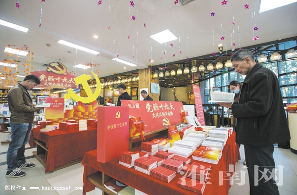 11月6日,记者采访中发现,淮南图书城一层最显眼的位置设立了党的十九大文件及学习辅导读物专柜,将最新出版的十九大报告单行本、《党的十九大报告辅导读本》等学习辅导读物,以及《习近平谈治国理政》等进行集中陈列,以方便读者翻阅、选购。据了解,十九大读物上架不到一周时间,已经卖出6000多册。