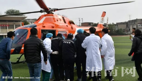 11月18日,一架救援直升机围绕淮南五中体育场上空盘旋一周后,稳稳地在停机坪降落。工作人员立即打开舱门,将一名患者抬到直升机舱内固定。