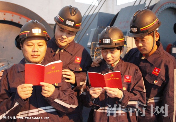 中煤新集口孜东矿及时将新党章发放到一线党员手中,并通过班前宣讲、集中讨论、座谈交流等形式,让每一名党员更加清晰地了解新党章的新内容。图为该矿一线党员共同学习新党章。