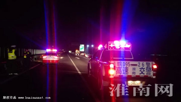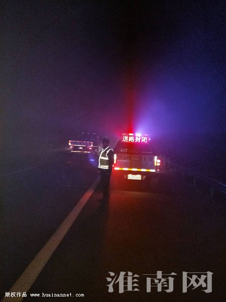 12月5日晚8时起,淮南高速公路境内大雾弥漫,尤其辖区滁新、蚌合、德上高速公路,全线能见度在50米以下,交警部门立即采取了交通管制措施,将辖区内淮南、寿县等10个收费道口全部关闭,禁止车辆继续驶入,已经在高速公路上行驶的车辆限速40千米/小时,并在省高速总队的统一部署之下,由合肥、阜阳、滁州等地高速交警联合开展分流,将高速公路上行驶的车辆引导至收费站,驶离高速公路,减缓雾区车流量积压。