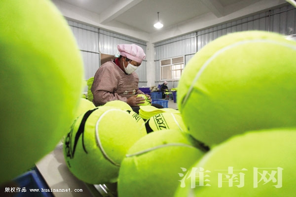 大通区在实施“工业强区”战略中,积极发展外向型经济,培育了国康体育、乐森黑马、富华服饰等一批外向型企业。安徽国康体育用品有限公司主要生产网球等产品,产品出口美国、德国、澳大利亚等十多个国家和地区,出口创汇1000多万元,带动60余人就业。图为国康体育签名大网球生产车间。