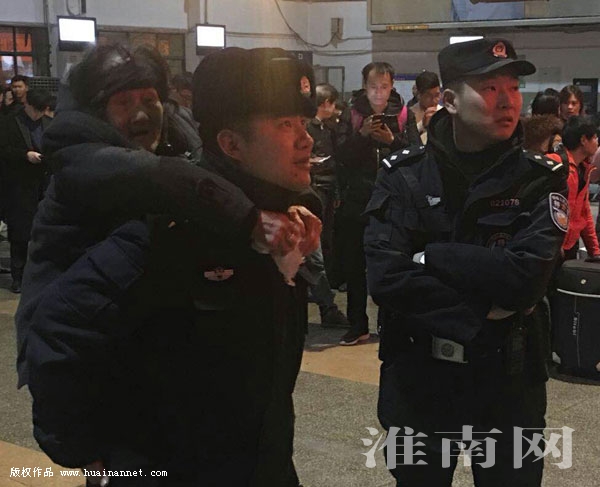 “这可怎么办呢?”12月8日晚10时30分,一位市民在淮南火车站站前广场上急的直跺脚,旁边坐着一位老太太。正在执勤的市公安局特警支队四大队火车站巡逻组发现这个情况后,上前询问得知,老太太和女儿打算赶夜里的火车去杭州,眼看火车就要到站,两人还没进站检票。而年近百岁的老太太瘫痪多年,走不动路,女儿不仅要扶着她还要拿着繁重的行李,心里十分着急。民警了解事情的缘由后,立刻联系火车站工作人员,开通了绿色通道。为了方便两人快速检票进站,辅警樊智龙背起老太太通过检票口,并将老人背送至列车座位上,得到了老人和家人的感谢,受到周围旅客的一致称赞。