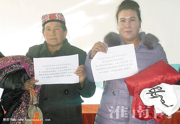 淮河早报、淮南网记者注意到,这些发往新疆的衣服,不少都是崭新的,尤其是童装,有的甚至连吊牌还没有摘下。收到这些衣服后,一些当地人在衣服的口袋里,还惊喜的发现了淮南少年儿童写给他们的寄语卡片,让他们十分感动。新疆伽师县的村民及和田地区策勒县的广大师生对淮南人民送去的这份情谊充满了感激。伽师县的村民专门请当地爱心人士打印了感谢字牌,在镜头前表达谢意。淮河早报、淮南网记者通过这些照片,看到字牌上写道:“新疆喀什地区伽师县和夏阿瓦提乡欧吐拉英买里村全体村民,衷心感谢淮南日报社、三毛户外俱乐部、淮南的警察同志们及淮师附小和田三小五(3)班的小朋友们、淮南幼儿园的小朋友们!”