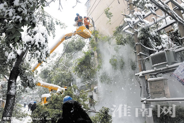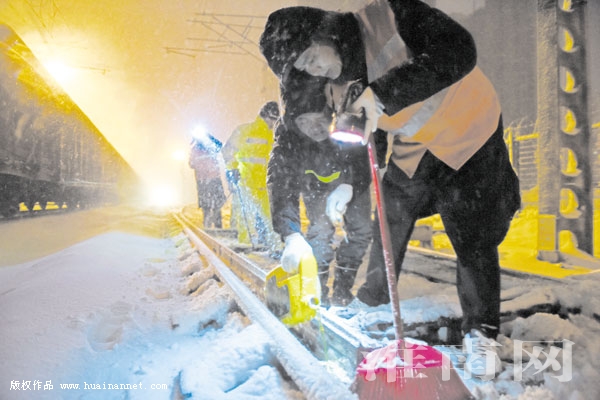 1月3日至4日,受暴雪影响,我市启动紧急预案,发布暴雪红色预警信号,各部门24小时值守,降低因暴雪带来的灾害损失,保障生产生活有序。图一:1月4日,淮南供电公司职工抢修因暴雪造成的停电,保证居民用电。图二:1月4日凌晨,淮南火车站职工雪夜除冰保障铁路客货运输线路畅通。图三:城管执法人员帮助受困车辆。