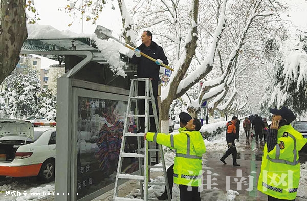 针对暴雪天气造成公交站亭顶棚积雪存在安全隐患,市运管处迅速行动,组织执法人员对全市公交站亭顶棚积雪进行清除,保障城市交通大动脉的畅通和市民安全出行。图为运管人员在清除公交站亭顶棚积雪。