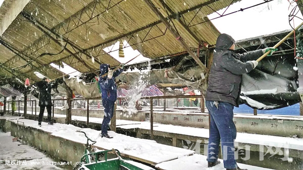 图二为市市场建设服务中心工作人员冒雪清除积雪确保市场安全。