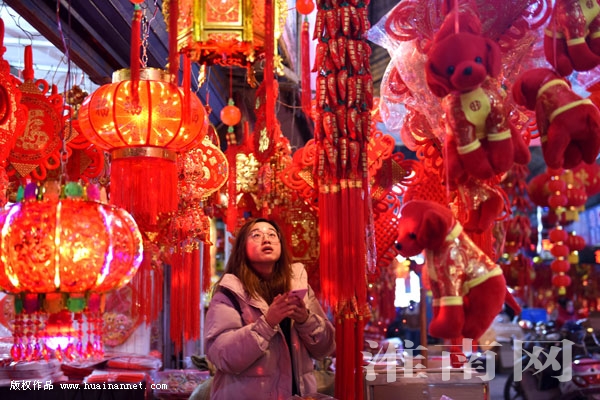 春节临近,各类具有传统年俗元素的装饰物件摆满年货市场,红红火火的新年挂件营造出浓厚的节日氛围。图为市民在田家庵区东城市场选购生肖装饰挂件。