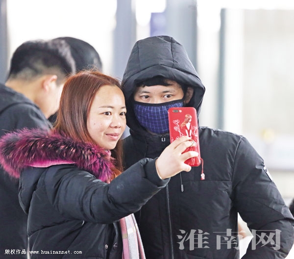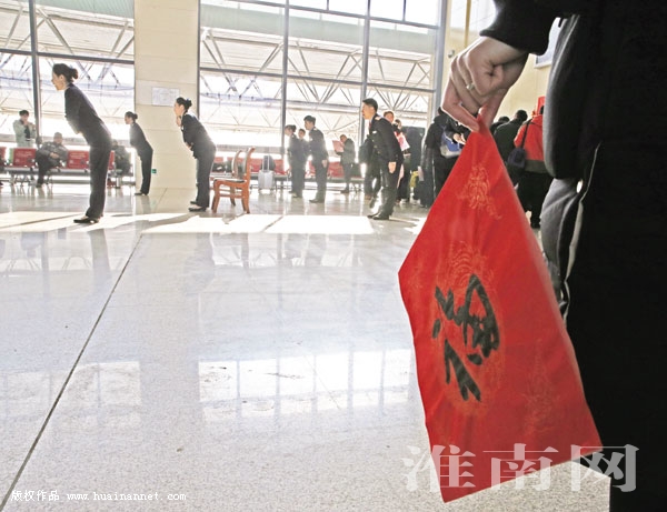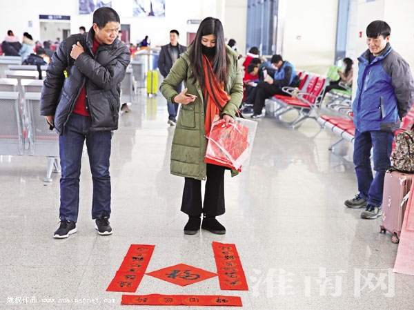 图八:志愿者向返乡旅客送上“福”字。