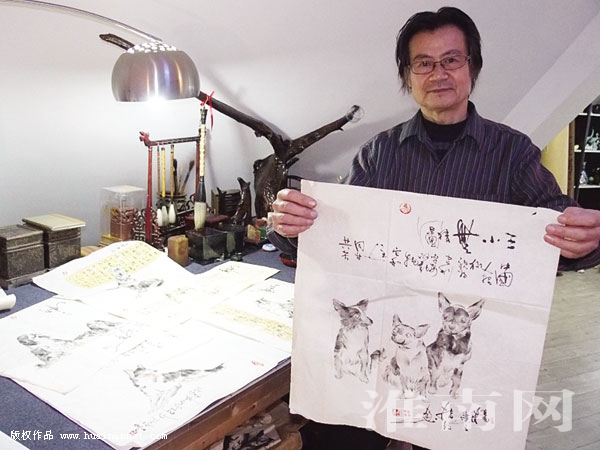 今年63岁的杨建立退休前在淮南三中任美术教师,在从合肥调到淮南前已举办过个人指纹画展,小有名气。在1998年调到淮南后,一直潜心指纹画的创作研究,独树一“指”,曾获著名作家冯骥才题写“手指能传万物神”。在淮南两届文博会及2017年合肥国际文博会上,其指纹画均获金奖。