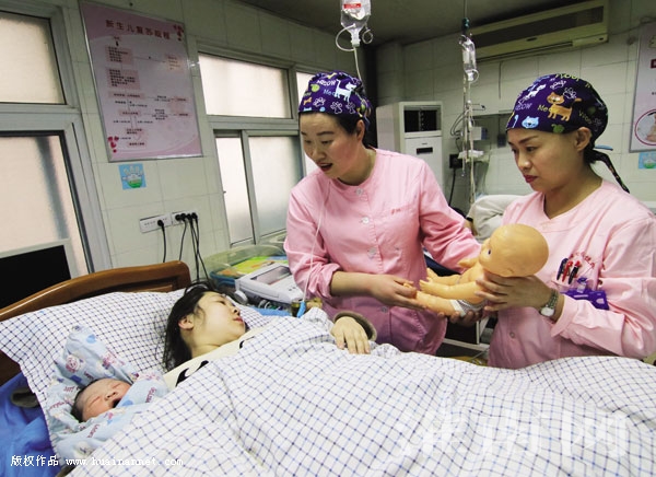 图二:3月7日,护士长王玲(中)在向产妇介绍新生儿护理知识。