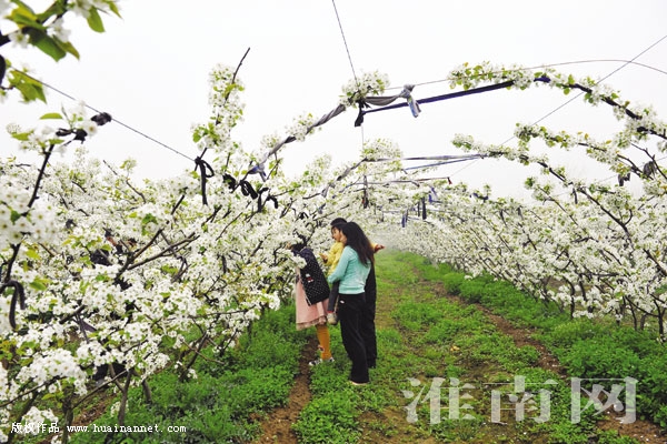 图一:游客们在杨公镇田丰瓜果有限公司的草莓大棚采摘草莓。图二:孙庙黄晶梨基地梨花盛开。