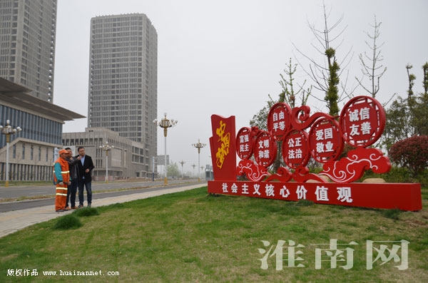 3月30日上午,市民和环卫工人在高新区瓦埠湖路、和悦街交口观看社会主义核心价值观公益广告。创建全国文明城市,社会宣传工作先行。高新区突出“讲文明树新风”公益广告、“图说我们的价值观”等重点宣传内容,制作了14块户外公益广告,分布在城区主要道口,营造了浓厚的创城社会氛围。