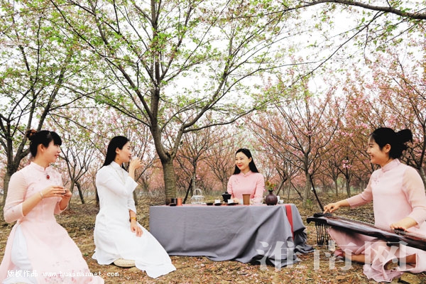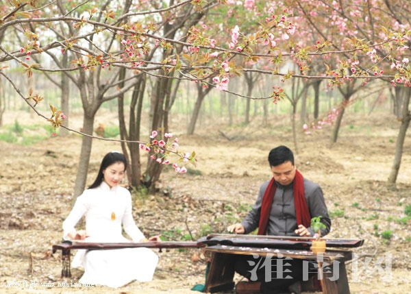3月31日,在长丰县义井乡的万亩樱花园里,淮南楚风文化的师生们抚习古琴、品味春茶,一派田园诗画情调。