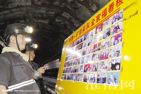 为增强职工安全生产意识,充分发挥亲情的感染作用,中煤新集公司将职工的全家福制作成亲情看板带到采煤工作面,时刻提醒职工:为了家庭的幸福,为了亲人的嘱托和期盼,严格按章作业,安全生产。图为新集一矿一线职工观看“全家福”。