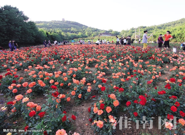 5月4日,游人在淮南市舜耕山月季园游览。