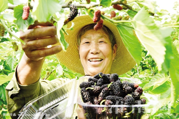 日前,大通区九龙岗镇王楼400亩葡萄、桑葚生态采摘园内,村里留守老人开心采摘丰收的桑葚。当地种植大户通过土地租赁,将高塘湖沿岸低洼地进行整理改造,科学种植桑葚、葡萄等经果林,注册“兴舜”商标,通过国家绿色食品认证,以农业产业结构调整带动淮河沿岸群众增收致富。