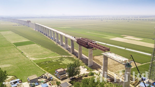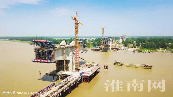 航拍施工中的商合杭淮河特大桥。日前,中铁八局商合杭站前十标项目部淮河特大桥跨淮河主桥工点喜获中华全国总工会“工人先锋号”荣誉称号。据了解,中铁八局承建的商合杭铁路淮河特大桥跨淮河连续钢构拱桥,全长452米,主跨228米,是目前高速铁路无匝轨道连续钢构拱桥世界第一,是商合杭铁路的重点控制性工程。