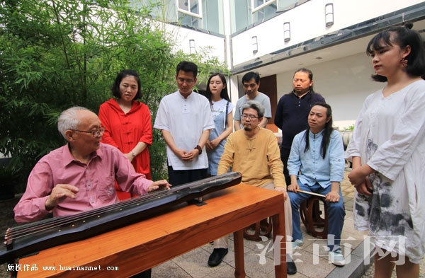 5月17日,古琴教育家王友斌先生(左一)与琴友进行演奏交流。当日,“虞弦雅韵 书乐淮南——皖黔川三地琴人古琴艺术交流会”在我市举行,来自贵州省、四川省及安徽省的知名琴友汇聚一堂,重奏泛川《流水》,再弹吴派《渔樵》。