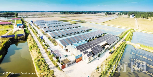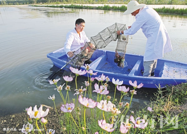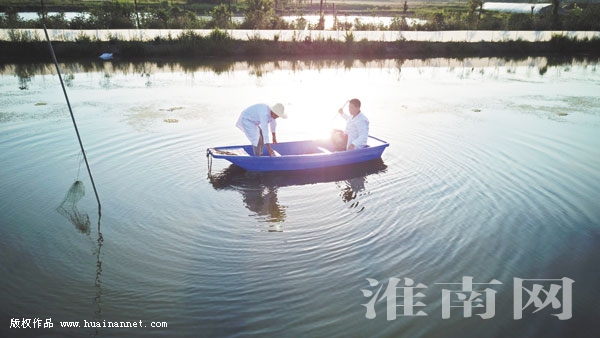 图七:夕阳下,虾塘收获忙