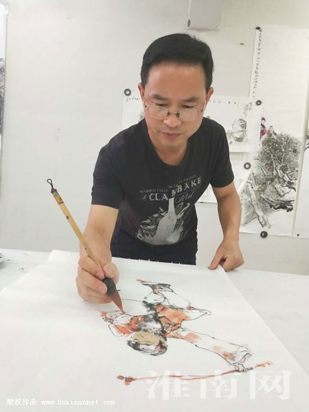 现任教于安徽工贸职业技术学院的胡传江一直以来对淮河文化,特别是花鼓灯情有独钟,在他看来,作为一个淮南画家,就应当把视野朝向身边的民间艺术,通过自己独特的视角,用画作的形式呈现出来。其创作的《花鼓情韵》长2.22米,宽1.24米,画作中五个民间艺人分别代表了老中青三代人,有历史,有传承,有延续,而五人的服饰又略微不同,其代表了凤台、怀远、颍上等地的花鼓灯艺术风格。为了创作这幅画,胡传江一年之内跑遍了与花鼓灯有关联的各个地方,通过参加当地的花鼓灯会,和老艺人、非遗传承人进行交流,让自己对花鼓灯有了更深刻的认识和理解。在他看来,很少有反应花鼓灯的题材画作,他便想通过自己的笔墨语言,通过对人物、动作、服饰、神态的细致刻画,反映出新时代背景下的民间艺术蓬勃发展之景。在一年的时间里,他完成了百幅速写,并几易其稿,最终形成了《花鼓情韵》这幅画作。