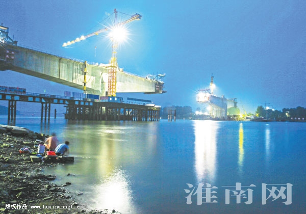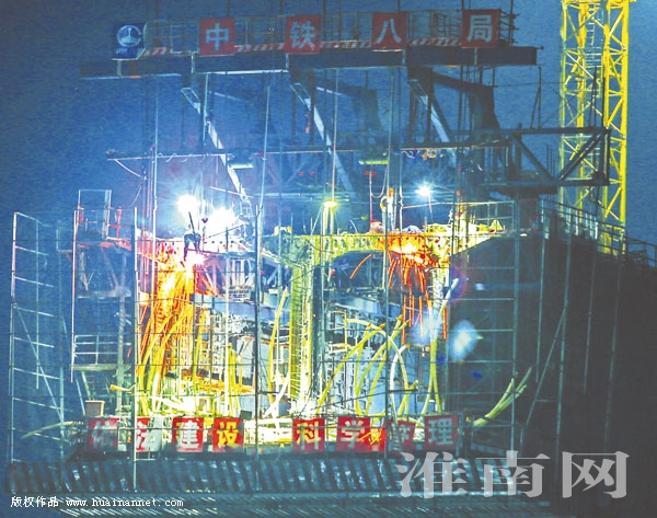 7月4日晚,一盏盏照明灯点亮淮河上空,一个个身影在灯光下忙碌,中铁八局的建设者全力以赴推进商合杭铁路淮河特大桥工程建设。目前,由中铁八局承建的商合杭铁路淮河特大桥跨淮河(112+228+112)m连续钢构拱桥已完成13#块悬臂节段施工,剩余11个悬臂节段;跨东淝河(112+224+112)m连续梁已完成14#悬臂节段施工,剩余10个节段;两个大跨度连续梁计划11月份合龙;86孔现浇梁(两个大跨桥梁间引桥)已完成79孔,剩余7孔;计划于7月30日前完成128m、两座80m连续梁施工。