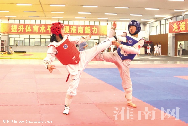 7月9日,记者从市跆拳道队了解到,安徽省第十四届运动会期间,我市将组织20余名优秀队员参与奖牌争夺,其中女队员夺金点相对较多。近期,市跆拳道队专门挑选一些攻击力相对更强的男队员和女队员开展对抗训练,进一步提升女队员的技战术水平。图为队员在进行对抗训练。