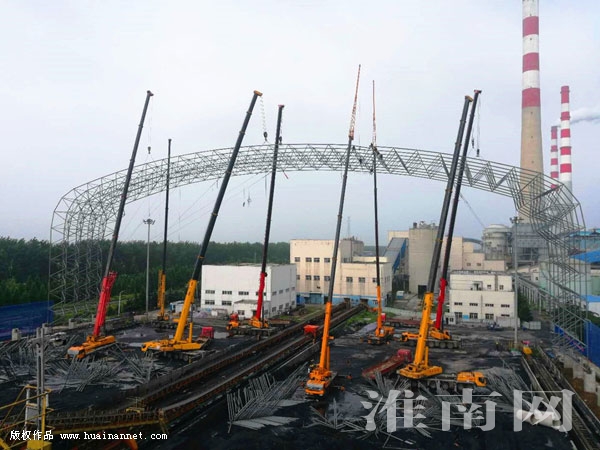 7月9日,全国第一例114米跨度门式空间网架结构干煤棚——大唐淮南洛河发电厂三期干煤棚改造工程首跨网架正式完成合龙。该工程设计封闭式煤棚纵向长度160米,跨度114米,最高高度为43米,建成后将完全匹配三期煤场所采用的门式斗轮机。鉴于该干煤棚跨度大、高度高,因此施工采取“最大可能地面拼装”和“最终高空对接”的方式进行,确保整个改造工程安全、优质、可靠。