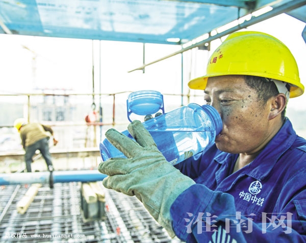 图二:坚守在商杭高铁淮河特大桥建设工人在施工间隙补充水分。