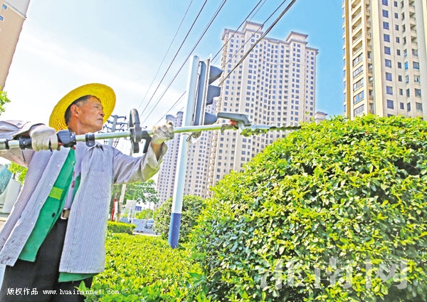 图三:园林工人在高温下修剪马路绿化带的树木。
